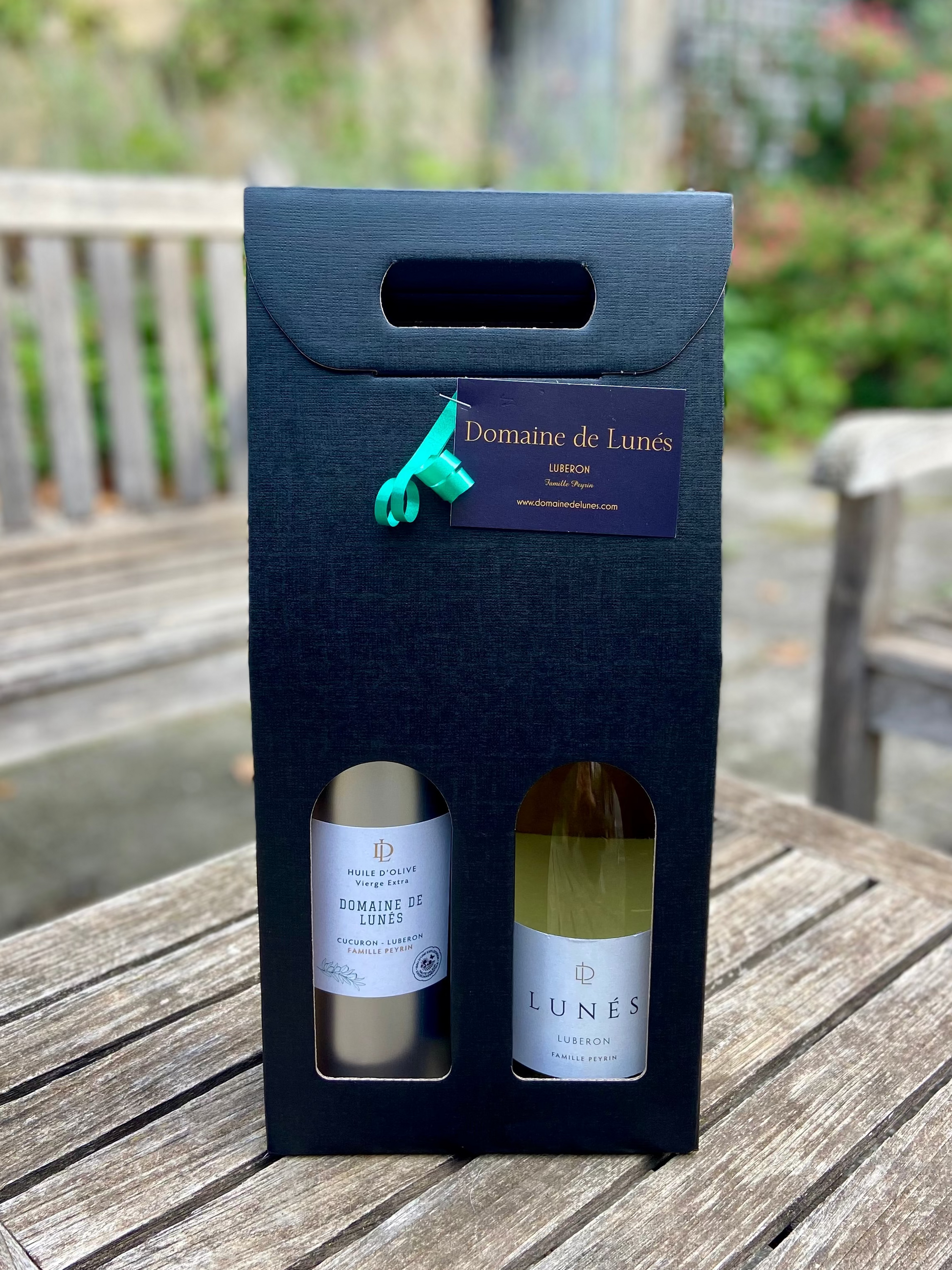 Coffret cadeau avec une bouteille de 1 litre d'huile d'olive et une bouteille de Lunés blanc.
